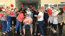 Segurando uma imagem do Divino Pai Eterno, Guilherme Queiroga, 43 anos, foi recebido com balões, música e o carinho dos seus familiares, além da celebração dos profissionais da saúde que o acompanharam durante o tratamento. Bastante emocionado, ele agradeceu ao carinho de todos. “Fico feliz por esse dia e grato por estar vivendo, com a ajuda de todos, o meu milagre. Me emociono ao saber quantos tiveram essa mesma alegria que eu e sinto muito por aqueles que não conseguiram”, expressou.