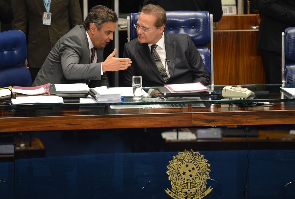 Presidente do Senado Federal, Renan Calheiros (D) confirma fragilidade de seu colega, o senador tucano Aécio Neves (E)