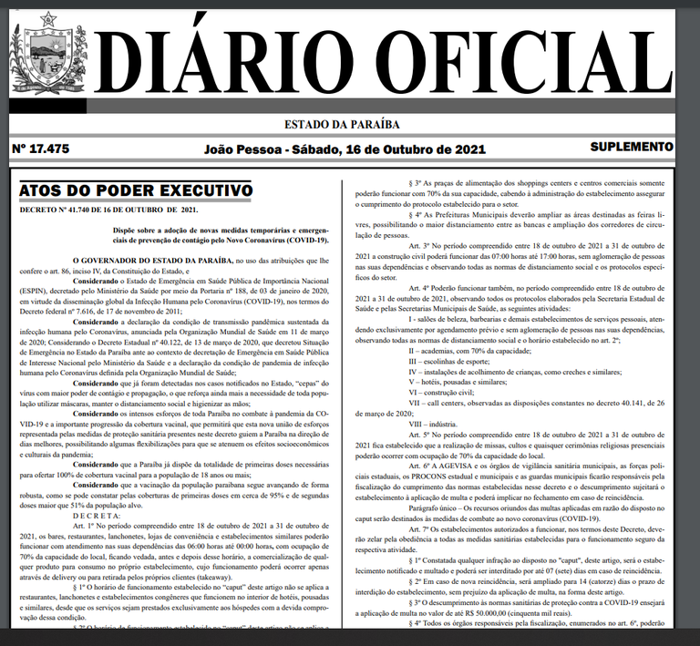 O novo decreto do Governo do Estado que disciplina as atividades na Paraíba a partir deste domingo (17) até o dia 31 de outubro amplia para 70% a capacidade de pessoas em igrejas, academias, lanchonetes, bares, restaurantes e lojas de conveniência.
