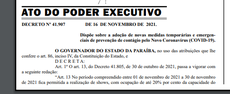 A mudança do artigo 13, do Decreto 41.805, de 30 de outubro de 2021, em vigor até o próximo dia 30, consta de novo decreto a ser publicado no Diário Oficial deste sábado (20).