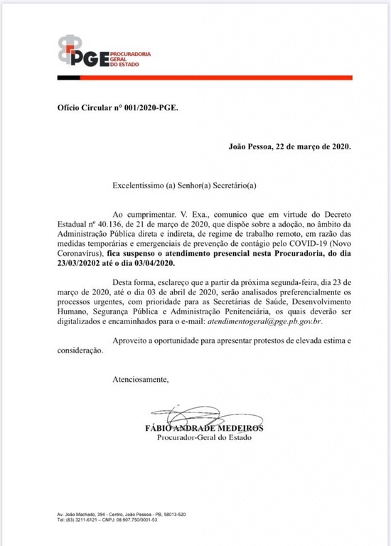 Em cumprimento ao Decreto Estadual nº 40.136, de 21 de março de 2020, que dispõem sobre a adoção do regime de trabalho remoto no âmbito da Administração Pública Direta e Indireta, dentro das medidas emergenciais de prevenção de contágio pelo novo coronavírus, o procurador-geral do Estado, Fábio Andrade Medeiros expediu Ofício Circular nº 001/2020 aos dirigentes de órgãos públicos estaduais e ao público em geral, comunicando a suspensão do atendimento presencial da Procuradoria-Geral do Estado, do dia 23/03/2020 até o dia 03/04/2020.