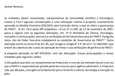 No documento, as entidades ressaltam que a modificação proposta não foi discutida anteriormente com o Conselho Diretor do FNDCT, com os Conselhos Gestores dos Fundos Setorias, com a Finep ou com os setores representativos da área de CT&I (empresariais, científicos ou ligados à inovação). Cabe ao MCTIC estabelecer as políticas de CT&I, e às agências a ele ligadas cabe a execução destas.