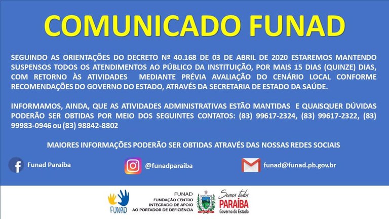 FUNAD MANTÉM SUSPENSÃO DOS ATENDIMENTOS DEVIDO À PANDEMIA DO NOVO COVID-19.