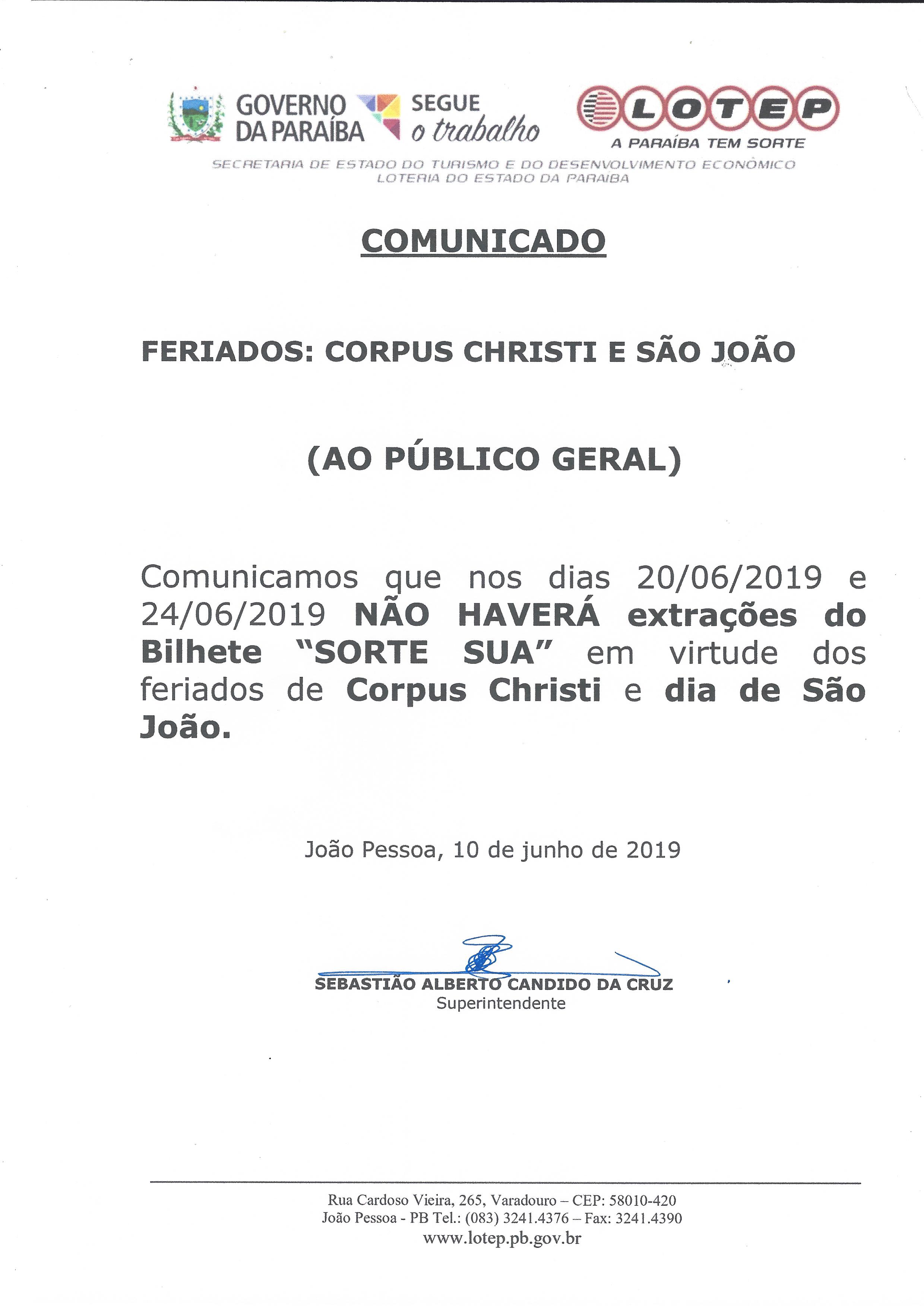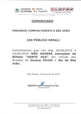 COMUNICADO OFICIAL (FERIADOS DE CORPUS CHRISTI E SÃO JOÃO)