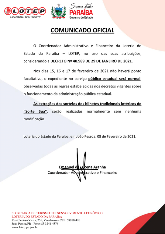 Você está aqui: Página Inicial > Adm. Indireta > LOTEP > Menu Principal > Notícias > Comunicado Oficial Carnaval 2021-2-1