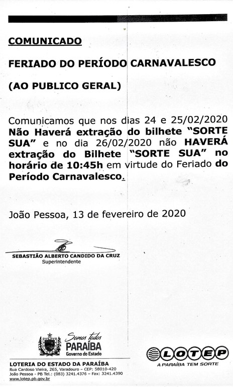 COMUNICADO OFICIAL (FERIADO DO PERÍODO CARNAVALESCO)