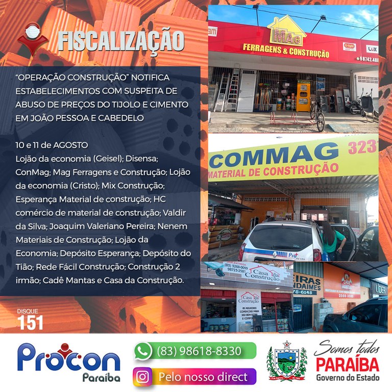 Você está aqui: Página Inicial > Adm. Indireta > PROCON > Notícias > “OPERAÇÃO CONSTRUÇÃO” DO PROCON-PB FISCALIZA 52 ESTABELECIMENTOS EM CIDADES DA PB COM SUSPEITA DE ABUSO DE PREÇOS