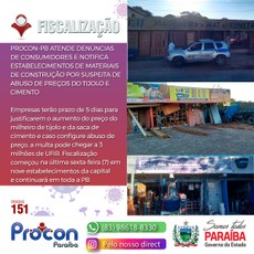 Oito empresas de matérias de construção foram notificadas na última sexta-feira (7) pela equipe de fiscais do Procon-PB, após denúncias de vários consumidores através do disque 151 e redes sociais do órgão, em que alegaram o aumento exagerado do preço do milheiro do tijolo do qual custava R$ 450 e passou ao valor de R$ 700, aumento em torno de 56%. Também foi verificado aumento do cimento. No total foram fiscalizados 9 estabelecimentos da capital paraibana.