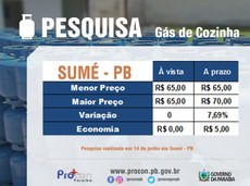 No munícipio de Sumé, o gás de cozinha GLP de 13kg estar custando à vista a um valor único de R$ 65 nos seis estabelecimentos de revenda da cidade, é o que constata a pesquisa realizada na última quarta-feira (14) pela Autarquia de Proteção e Defesa do Consumidor da Paraíba (Procon-PB). De acordo com o levantamento, para quem for comprar o gás no cartão, está variando de R$ 65 no Brasil Gás até R$ 70 nas demais revendedoras pesquisas.