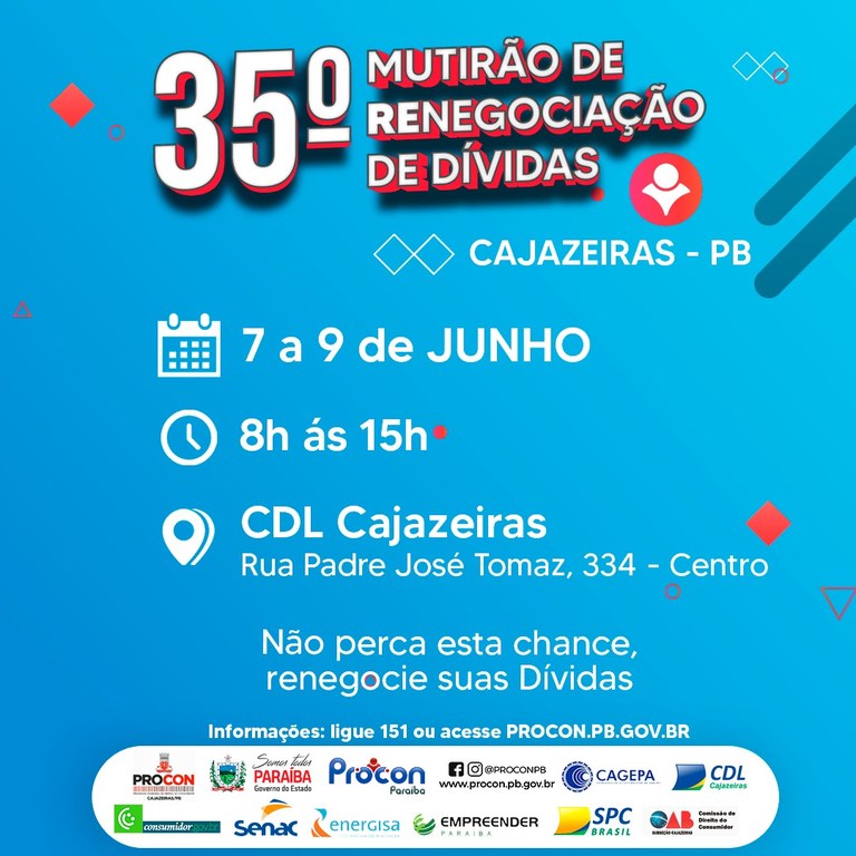 O Governo do Estado da Paraíba, através do PROCON-PB em parceria com a Prefeitura e o Procon Municipal de Cajazeiras, promovem o 35° Mutirão de Renegociação De Dívidas