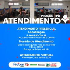 A Autarquia de Proteção e Defesa do Consumidor, PROCON-PB, através do Setor de atendimento, está de portas abertas para garantir o direito dos consumidores. O consumidor pode se dirigir à sede do Procon Estadual, localizada na Av. Almirante Barroso n° 693, Centro de João Pessoa. O atendimento é realizado de segunda a sexta-feira, no horário das 08h às 16:30 da tarde.