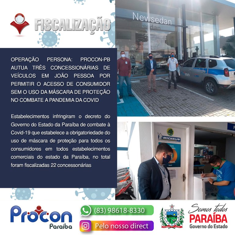 OPERAÇÃO PERSONA: PROCON-PB AUTUA TRÊS CONCESSIONÁRIAS DE VEÍCULOS EM JOÃO PESSOA POR PERMITIR O ACESSO DE CONSUMIDOR SEM O USO DA MÁSCARA DE PROTEÇÃO NO COMBATE A PANDEMIA DA COVID-19