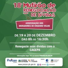 Foi acordado que acontecerá o 18º Mutirão de Renegociação de Dívidas na sede da Associação, nos dias 19 e 20 do corrente mês, nos mesmos moldes dos Mutirões anteriores nos horários de 8hs às 16hs para atender os moradores do Engenho Velho e adjacências. “A nossa satisfação em oportunizar aos moradores acordos satisfatórios entre consumidores e empresas é um marco do trabalho que a gente vem desempenhando ao logo dos anos em que estamos a frente da Autarquia de forma a reinseri-los ao mercado de consumo”, enfatizou Késsia Cavalcanti