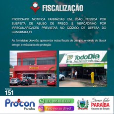 PROCON-PB NOTIFICA FARMÁCIAS EM JOÃO PESSOA POR SUSPEITA DE ABUSO DE PREÇO E MERCADINHO POR IRREGULARIDADES PREVISTAS NO CÓDIGO DE DEFESA DO CONSUMIDOR
