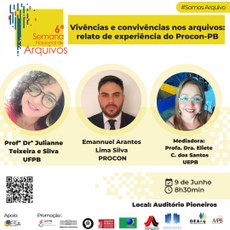 No dia internacional do arquivo, 9 de junho, das 8h30 às 12h, o Gerente de instrução processual e cartorial do PROCON-PB, Emannuel Arantes Lima Silva irá palestrar na 6ª Semana Nacional de Arquivos (SNA) sobre o tema “Vivências e convivências nos arquivos: relato de experiência do Procon-PB”, na Universidade Estadual da Paraíba (UEPB).