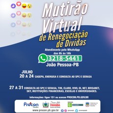 É simples, rápido e seguro. O I Mutirão Virtual de Renegociação de Dívidas é uma oportunidade que o Procon-PB oferece para que os consumidores pessoenses possam, no conforto e segurança da sua casa, realizar a negociação dos seus débitos junto as empresas, trazendo o equilíbrio e a paz nesse momento tão difícil.