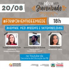 O bate-papo faz parte da programação do Mês da Juventude 2020, que, neste ano, será realizado inteiramente de modo virtual. A Sudema será representada por sua coordenadora de Educação Ambiental, Taciana Wanderley Cirilo.
