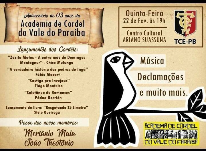 O Tribunal de Contas da Paraíba realiza, nesta quinta-feira (22), às 19h, por meio do Centro Cultural Ariano Suassuna e da Academia de Cordel do Vale do Paraíba, o primeiro Sarau Poético da temporada/2018 de eventos culturais. O evento celebra a arte do cordel e dedica parte de sua programação à atriz Zezita Matos, que será homenageada em folheto do poeta Chico Mulungu.