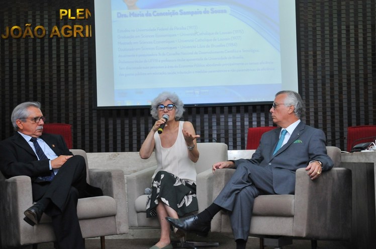 Ao final da palestra, a professora Maria da Conceição Sampaio, ao lado do conselheiro Fernando Rodrigues Catão - coordenador da Ecosil, e do secretario, advogado Carlos Aquino, participou de um debate sobre o tema e respondeu questionamentos dos participantes. (Palestra na íntegra no Youtube - TVTCE-PB)